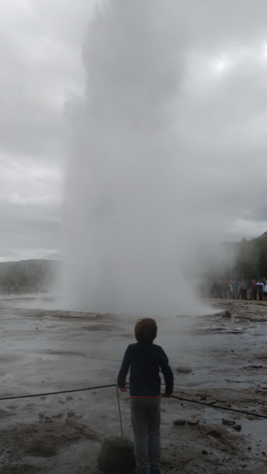 En Geysir puedes pasar un buen rato intentando sacar fotos al géiser en el momento preciso, yo después de unos cuantos intentos fallidos conseguí capturar el momento en que se forma la burbuja antes de que el agua salga disparada hacia arriba. También hicimos una ráfaga de fotos desde el lado en el que más te mojas que luego hemos convertido en un GIF que nos encanta 🙂
