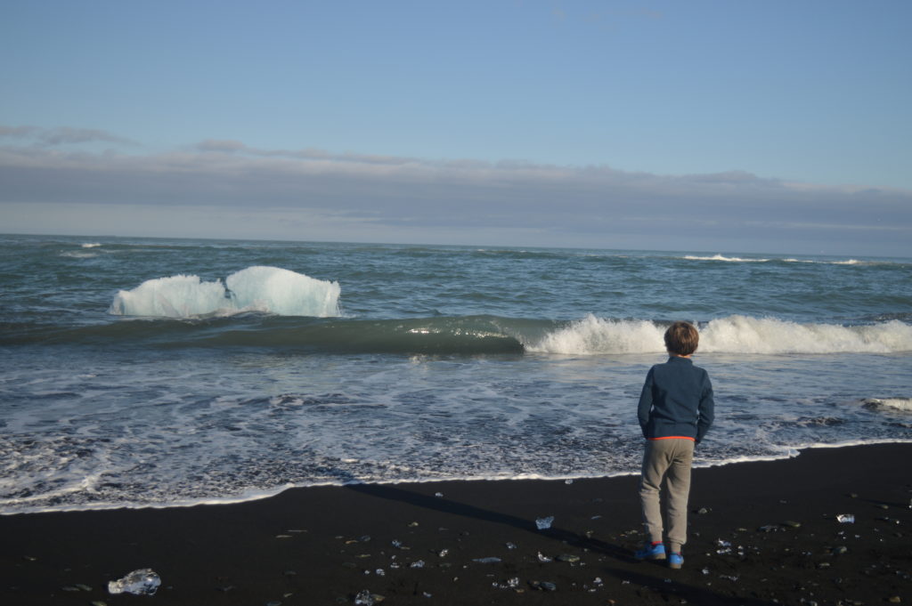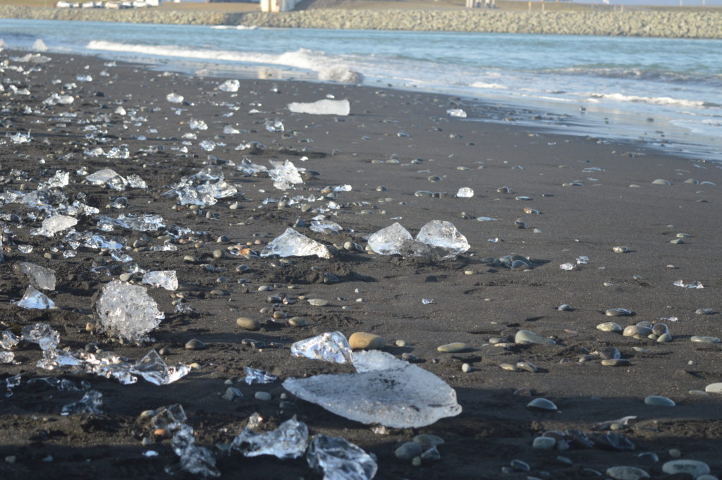 Después de visitar Jökulsárlón fuimos a Diamond Beach, una playa de arena negra que está llena de trozos de iceberg que han salido al mar desde la laguna y las olas traen a la orilla. Incluso había un iceberg pequeño meciéndose entre las olas.