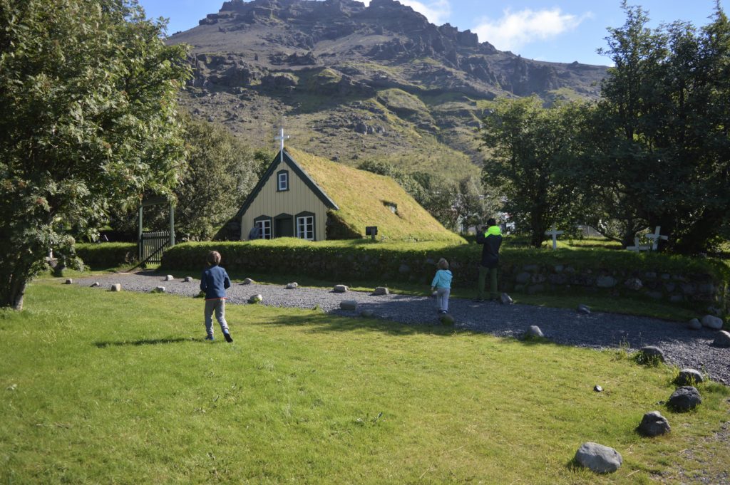 Antes de irnos de Nónhamar nos acercamos a ver Hofskirkjauna pequeña iglesia que había justo al lado de las cabañas, con el tejado cubierto de hierba y un pequeño cementerio al lado.