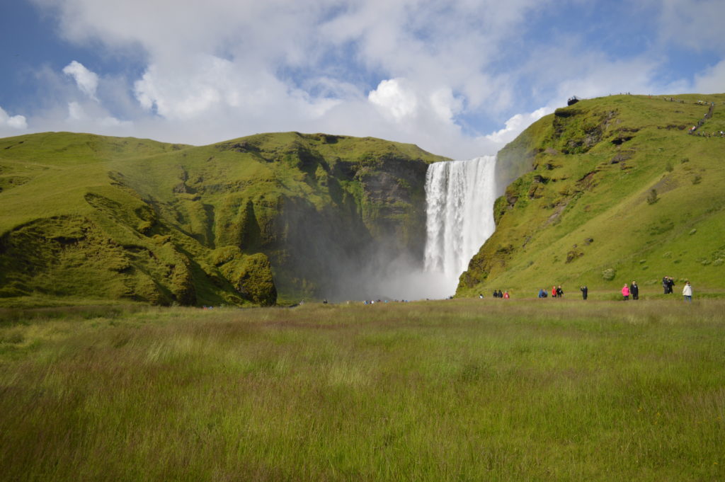 Nuestra siguiente parada fue en Skógafoss, una cascada a la que te puedes acercar por la base y empaparte y también puedes subir para verla desde arriba. Nosotros optamos por la primera opción, por supuesto, jeje, convenientemente protegidos con ropa impermeable, aunque había algunos valientes que se acercaban a la catarata con una simple camiseta, imagino que luego se ponían ropa seca y listo.